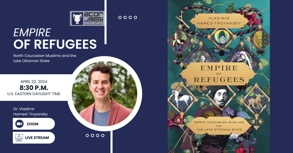 In our next lecture, which will be presented only remotely on April 22, 2024, at 8:30 p.m. U.S. Eastern Time via Zoom and YouTube livestream, Dr. Vladimir Hamed-Troyansky will talk about his newly published book _Empire of Refugees: North Caucasian Muslims and the Late Ottoman State_ (Stanford University Press, 2024). In this compelling work, he discusses an historical narrative spanning the late Ottoman era, focusing on the influx of approximately one million Muslim refugees from Russia between the 1850s and World War I. These refugees, settling across the Ottoman Levant, Anatolia, and the Balkans, played a pivotal role in shaping the demographic landscape of the region. The contributions of Circassian and Chechen refugees extend beyond mere resettlement; they were instrumental in the founding of numerous villages, as well as three of the four largest cities in Jordan, among them Amman. Dr. Hamed-Troyansky’s research, drawing from extensive archival materials in Arabic, Ottoman Turkish, and Russian sourced from Jordan, Turkey, Russia, and beyond, sheds light on this often-overlooked aspect of Ottoman history.