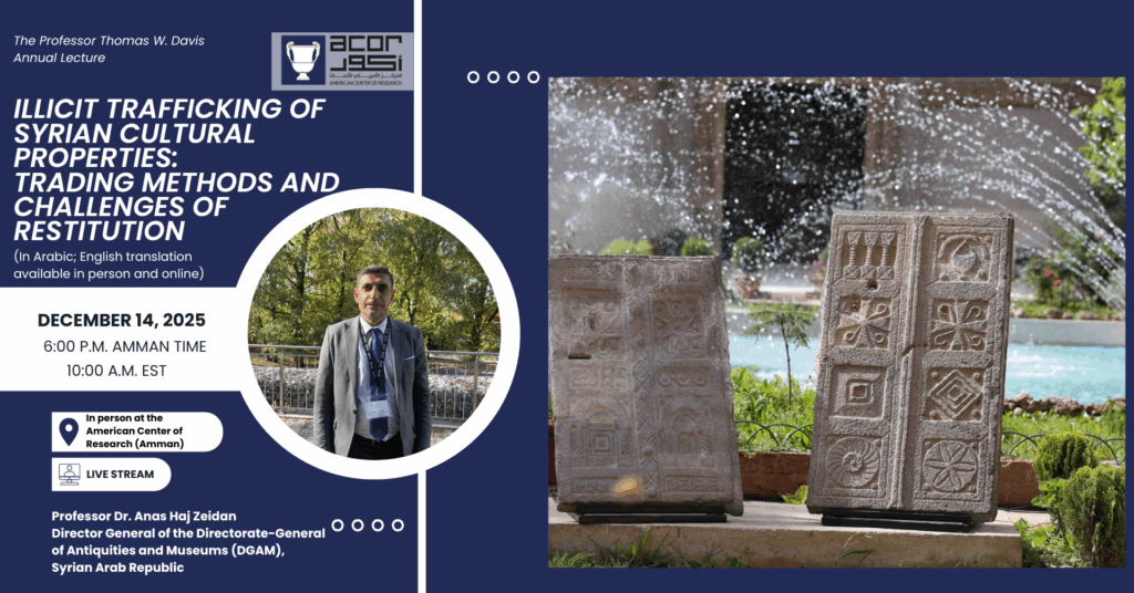 Prof. Dr. Anas Haj Zeidan, director general of the Directorate-General of Antiquities and Museums (DGAM) of the Syrian Arab Republic, will present “Illicit Trafficking of Syrian Cultural Properties: Trading Methods and Challenges of Restitution.” In addition to addressing the role of the DGAM in documentation processes for cultural properties, this lecture will cover penalties for trafficking under the current Syrian Antiquities Law, the status of antiquities outside Syria, and the roles of Customs and the Ministry of Interior in the protection of cultural property.